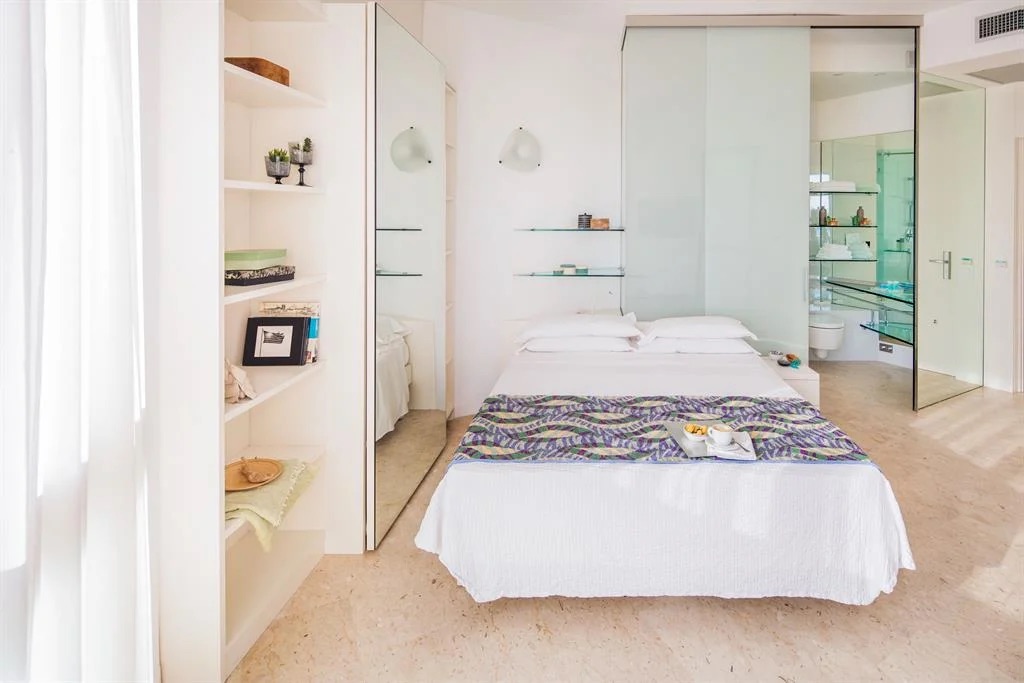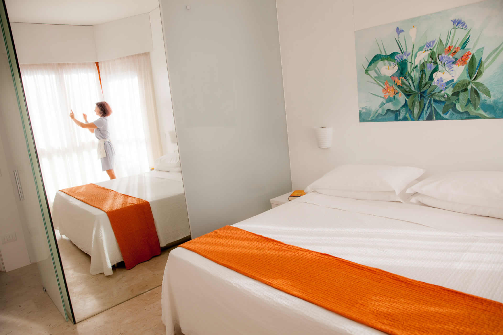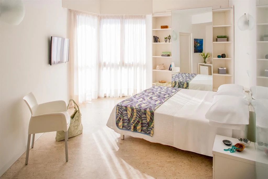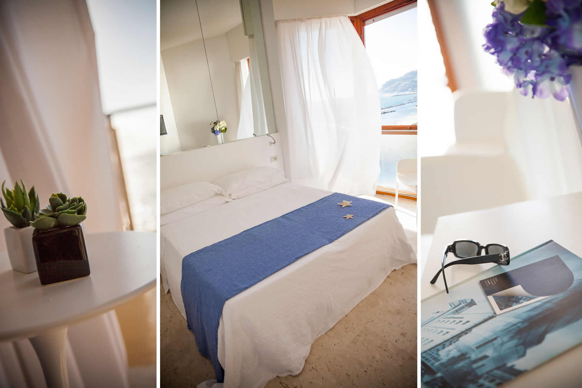 Every room is unique, enhanced by an original artwork by Renato Allegro or Piera Raimondo, with elegant minimalist design and refined crystal details in the bathroom.