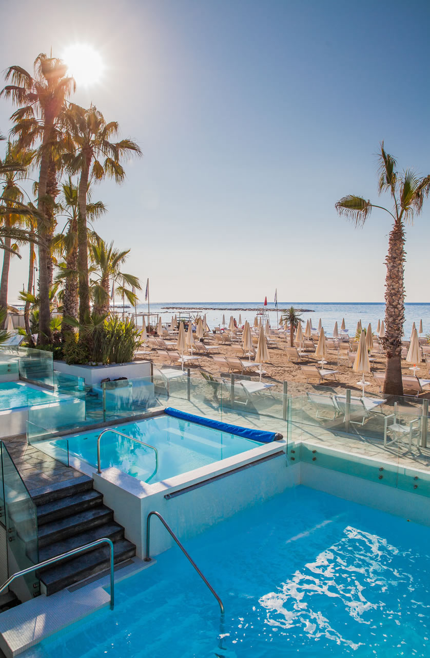 From the hotel, guests have direct access to the wide private beach right on the seafront, reserved exclusively for hotel guests and included in the stay.